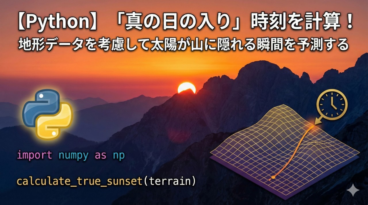 そこで今回は、「指定した座標から見た地形(山並み)を考慮し、真の日の出・日の入り時刻」を計算するPythonスクリプトを自作しました。APIを使った地形データの取得から、計算ロジックの工夫、そして開発中にハマったポイントまでを共有します。