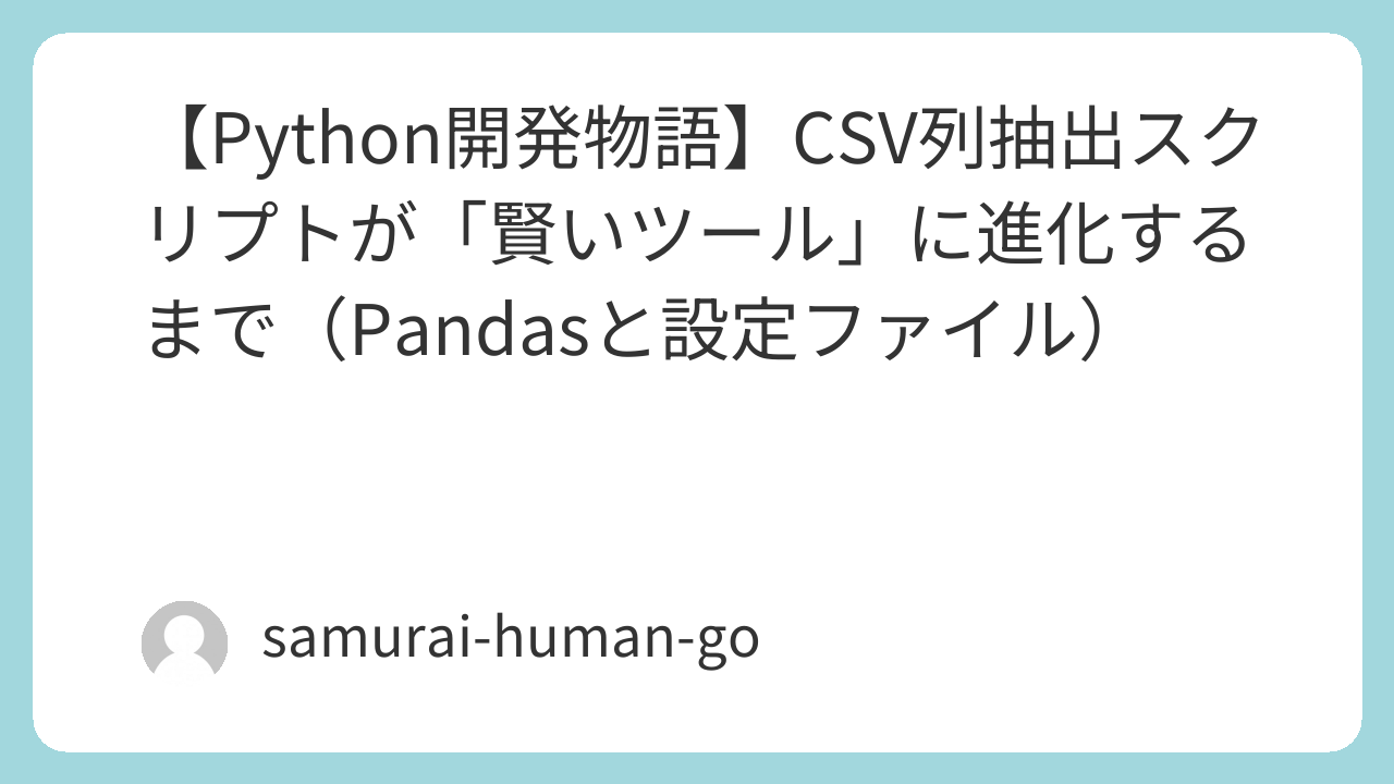 ユーザーが編集するための、シンプルな設定ファイルを用意しました。Pythonのコードを触ることなく、入力ファイル名、出力ファイル名、抽出したい列を自由に変更できます。[SETTINGS] input_csv_file = csv_column_extractor/source_data.csv output_csv_file = csv_column_extractor/extracted_data_pandas.csv target_headers = 氏名,年齢,部署