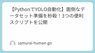 ALL 【PythonでYOLO自動化】面倒なデータセット準備を秒殺!3つの便利スクリプトを公開 こんにちは、Tech Samuraiです!AIによる物体検出モデル「YOLO」を使ったカスタム学習は、非常にエキサイティングですよね。しかし、YOLOの学習を経験した人なら誰もが同意する、一つの「壁」があります。それは、モデルのチューニング... 2025.10.31 ALLPythonソフトウェア