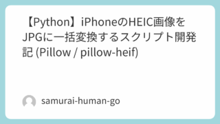 Python 【Python】iPhoneのHEIC画像をJPGに一括変換するスクリプト開発記 (Pillow / pillow-heif) こんにちは、Tech Samuraiです!最近、YOLOのカスタム学習のためにiPhoneで撮影した大量の写真をPCに取り込んだのですが、ある問題に直面しました。画像の拡張子が、すべて「.heic」なのです。HEIC (High Effic... 2025.10.31 Pythonソフトウェア